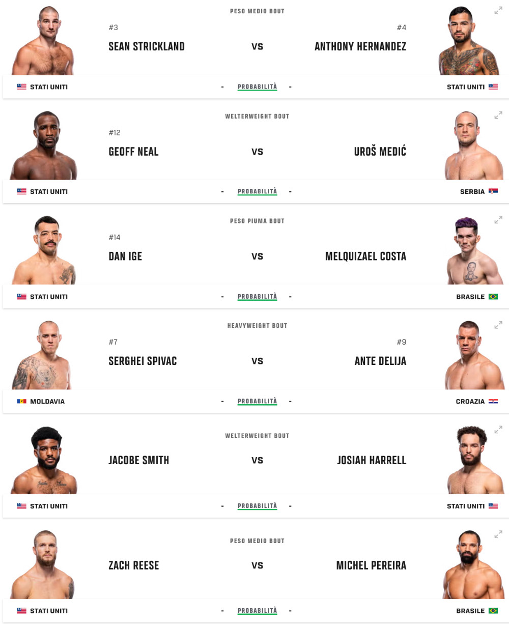 Il filo conduttore della card è chiaro anche guardando le quote: i favoriti sono ben delineati, ma quasi mai inattaccabili. In diversi match il mercato premia chi ha più continuità e più strade per vincere, ma le differenze non sono così ampie da escludere colpi di scena. Hernandez è nettamente avanti su Strickland, Costa parte favorito su Ige, Neal ha il vantaggio su Medić e Pereira viene considerato avanti su Reese, ma in tutti questi incontri basta poco per cambiare l’inerzia: un ritmo che cala, una lotta che prende piede, un errore di distanza.