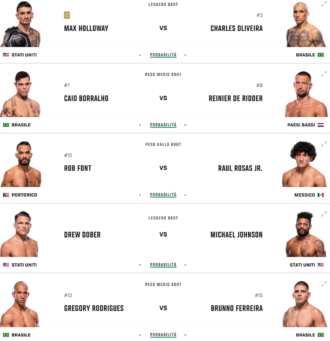 Negli ultimi incontri, Holloway ha mostrato solidità e continuità, vincendo contro avversari di alto livello e confermando di essere ancora uno dei riferimenti della categoria. Oliveira, dal canto suo, ha alternato vittorie spettacolari a battute d’arresto, ma quando riesce a imporre il suo ritmo resta uno dei combattenti più pericolosi in assoluto. I dati recenti parlano di un Holloway più costante nei risultati, mentre Oliveira tende a vivere match più estremi, o dominanti o molto complicati.