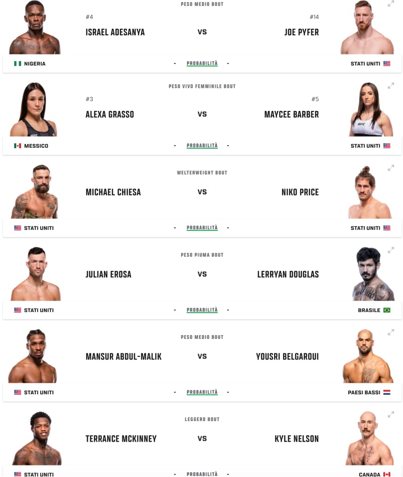 Il match quindi si gioca su due scenari: o Pyfer accorcia e impone ritmo alto, oppure Adesanya controlla e porta il match sul suo terreno.