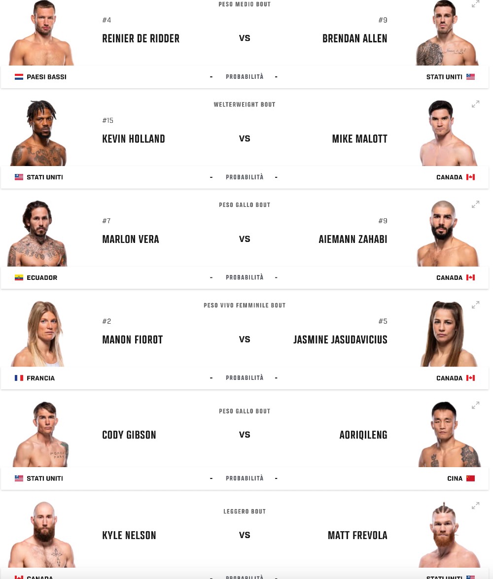 Il resto della main card presenta incroci tecnici e narrativi forti: Marlon Vera contro Aiemann Zahabi, cioè volume intermittente ma colpi di qualità del primo contro il rigore e le letture pulite del secondo; Manon Fiorot, striker metodica con footwork disciplinato, affronta Jasmine Jasudavicius, wrestler/grappler canadese capace di sporcare il ritmo; Cody Gibson contro Aoriqileng per un confronto tra pressioni e scambi in pocket; e Kyle Nelson vs Matt Frevola, che promette sequenze di entrate esplosive e scramble caldi.