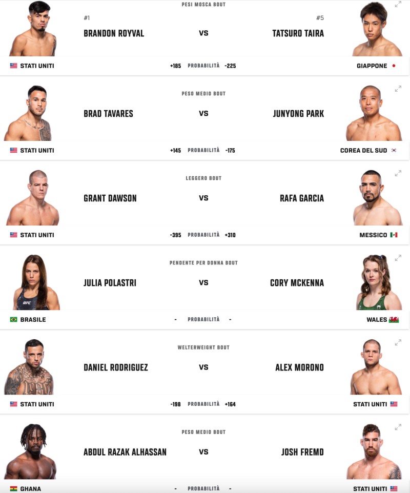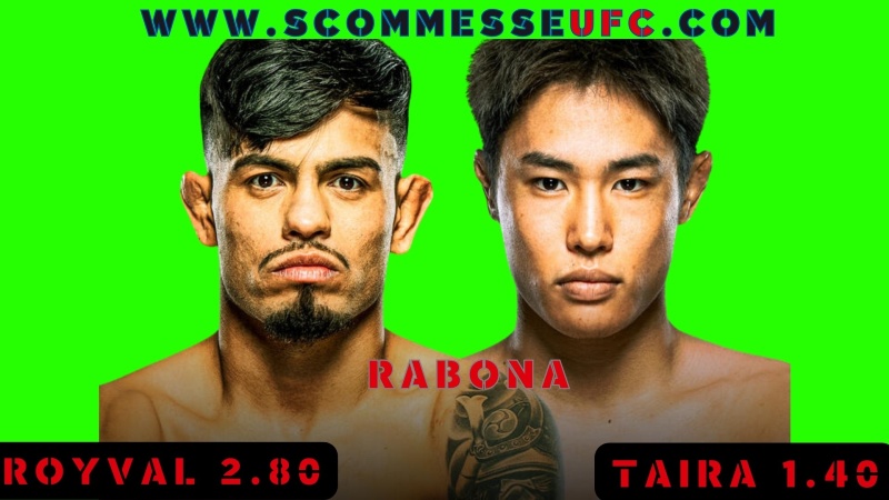 Noi di scommesse UFC ci aspettiamo una vittoria di Tatsuro Taira. Il combattente giapponese sfrutterà il suo vantaggio nel grappling, nonostante sia uno striker discreto è il suo gioco a terra che potrà aiutarlo contro un fighter come Royval. I colpi e il cuore di quest’ultimo sono armi che sfodera in ogni suo match, ma quando finisce spalle al tappeto si nota qualche limite. Questo sarà in tipico combattimento in cui verranno messe alla prova le abilità e l’adattabilità di entrambi gli sfidanti.