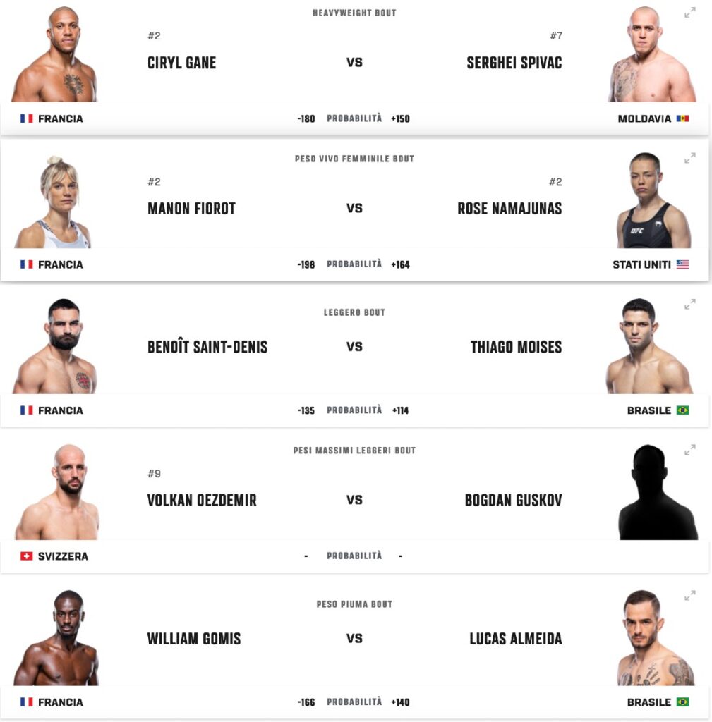 Questo weekend invece, Ciryl Gane dovrà affrontare il moldavo Sergey Spivak, lottatore con caratteristiche del tutto differenti da Tuivasa, ma dal livello di pericolosità simile. Secondo le quote offerte dai nostri bookmakers (Rabona -22bet -1bet), il francese è favorito: Gane (1.52), Spivac (2.50).