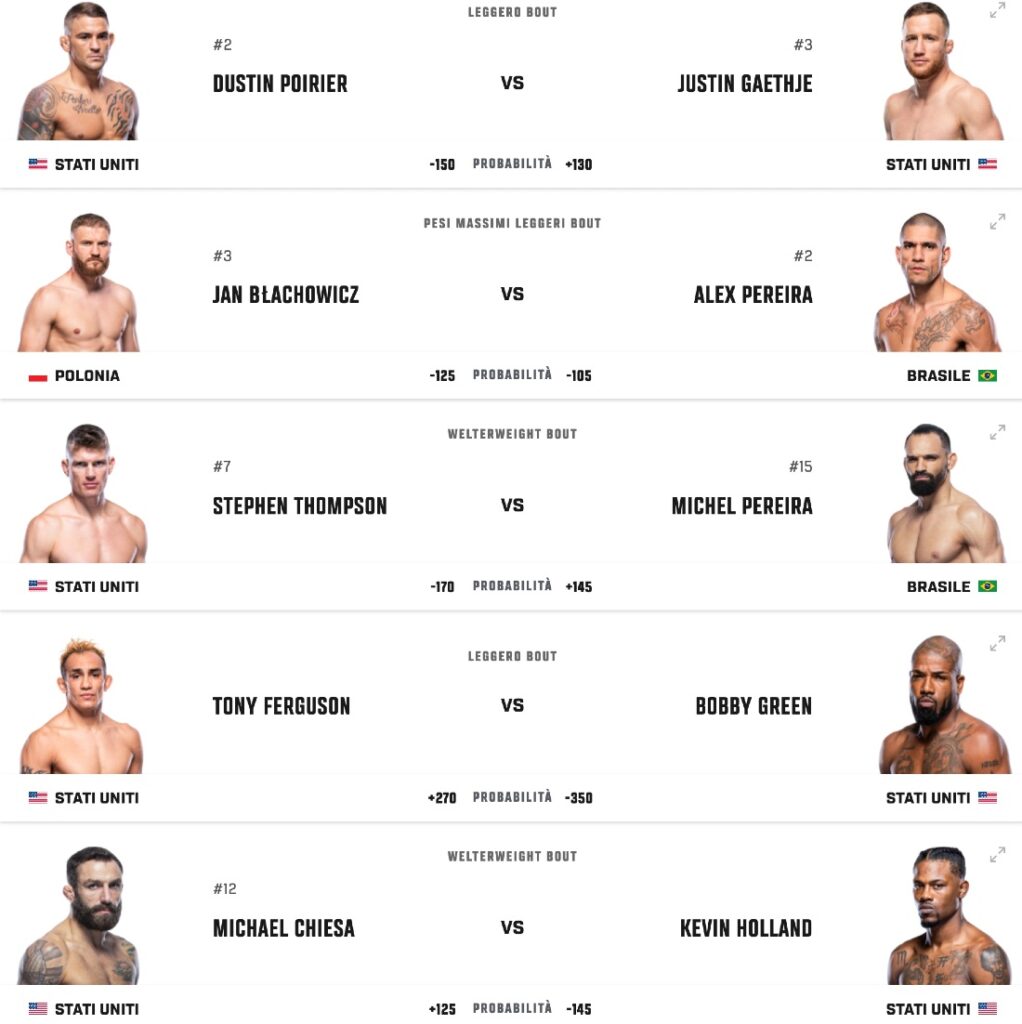 Le quote ufficiali di UFC bancano la vittoria di Blachowicz -170 (il che significa che per vincere 100$ occorre giocarne 125$) sancendo Pereira leggermente sfavorito – 105.
