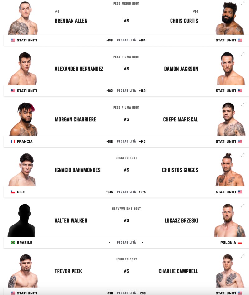 Salve a tutti amici di scommesseufc.com, sabato 6 aprile è pronto da servire l’ultimo antipasto prima di UFC 300. Brendan Allen contro Chris Curtis si affronteranno in una rivincita di cinque round, ricordiamo che al posto di Curtis sarebbe dovuto esserci il nostro Marvin, assente a causa di un infortunio. La card vede anche Alexander Hernandez provare a riemergere sfidando il veterano Damon Jackson, anche il transalpino Morgan Charriere tenterà di raddoppiare in UFC sfidando Chepe Mariscal.