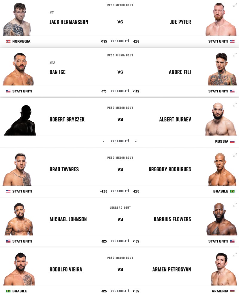 Questa è una grande test di maturità sportiva per Joe Pyfer, e siamo fiduciosi che sarà all’altezza della situazione. La nostra stima per lo svedese Jack Hermansson è incondizionata, ma in questo capitolo non riusciamo a vedere una situazione positiva per lui.