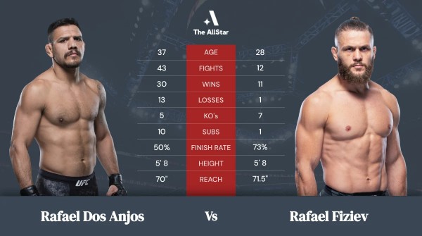 Rafael dos Anjos brasiliano classe ’84 con un record di 30-13-0. Nel suo ultimo incontro è ritornato nei pesi leggeri sconfiggendo Paul Felder e guadagnandosi il fight of the night. Dos Anjos non ha avuto successo nella categoria welter ed è tornato nei light a fine 2020, pronto a rivendicare ancora una volta la cintura in questa complicatissima divisione. Nel 2017 fece il debutto nei welter e vinse 3 match consecutivi: Saffiedine, Magny e Lawler. Successivamente 2 sconfitte con i migliori della categoria, Usman e Covington entrambi ai punti. Nel 2019 un inaspettata vittoria contro un favorito Kevin Lee sottomettendolo, dopodiche una sconfitta con Edwards e nel 2020 con Chiesa.